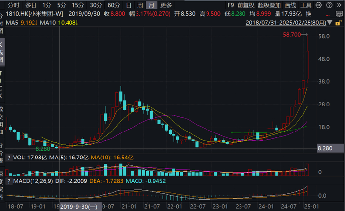 那时,所有人都认为,小米还会跌到4港元/股,谁能想象6年后的今天,小米股价能从低点暴涨6倍,达到近60港元/股,冲击1.5万亿港元市值?