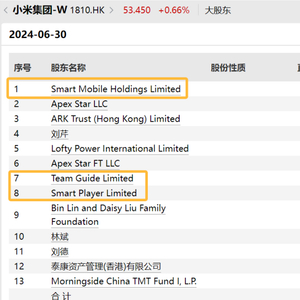 简单翻译下就是,小米集团目前第一(持股23.59%)、第七(持股0.37%)、第八大股东(持股0.24%)均由雷军家族信托100%持有。
