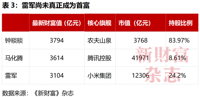 雷军目前身家3104亿元,虽尚未成为首富,但也已跻身3000亿梯队,小米集团若股价再涨20%,雷军财富就将追平钟睒睒(表3)。