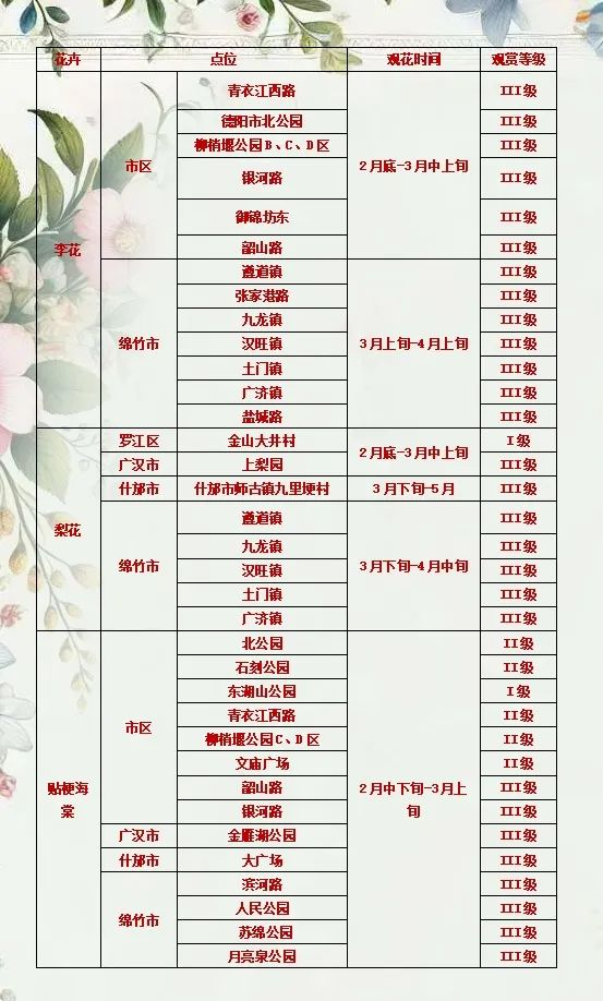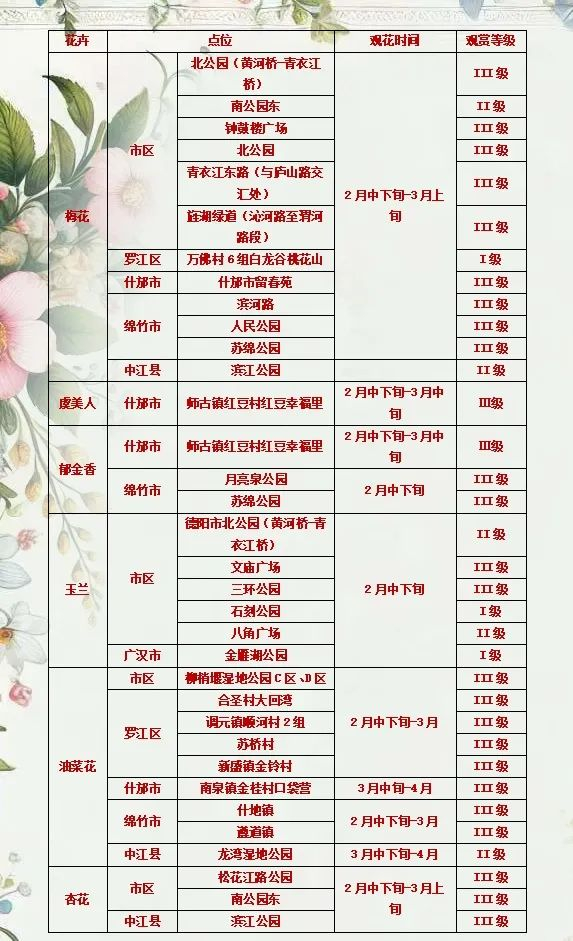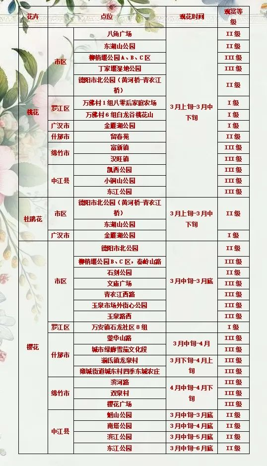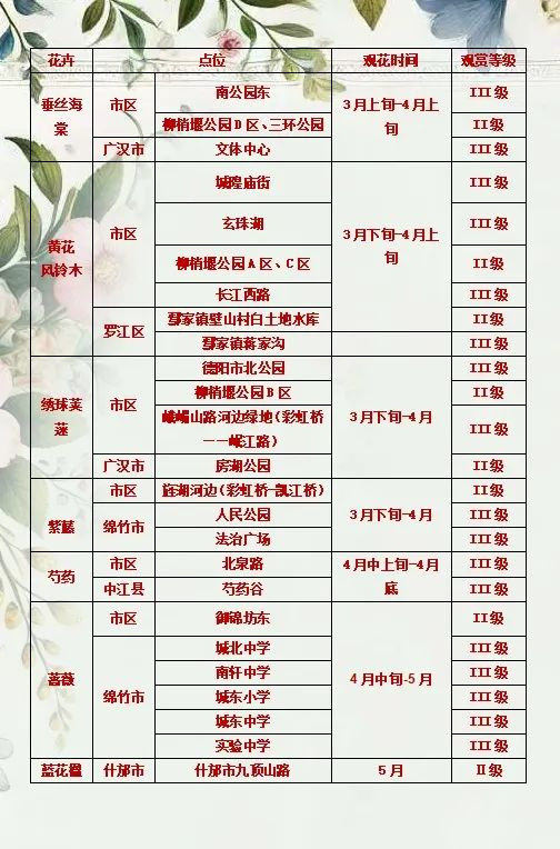 为了不错过每一朵花的盛放时刻,这里为大家整理了一份德阳春季主要花卉的观赏时间及分布地点指南。
