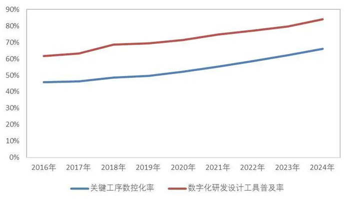 工业数字化应用程度不断加深。2024年我国企业两化融合发展水平为63.6,同比增长2.36%,规上工业企业关键工序数控化率、数字化研发设计工具普及率、经营管理、供应链管理、客户服务、产品数字化普及率分别为66.2%、84.1%、78.7%、36.5%、64.1%、67.9%。工业互联网产业增加值规模总计达5.01万亿元,较2023年增长6.45%,占GDP比重为3.81%,对经济的带动作用稳中有升,“5G+工业互联网”建设项目数超1.7万个,实现41个工业大类全覆盖。
