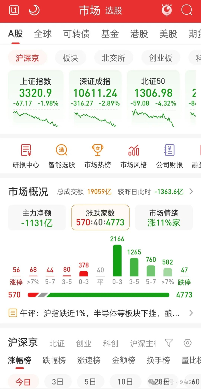 今日A股三大指数单边下跌,市场陷入普跌格局,恐慌情绪显著升温: