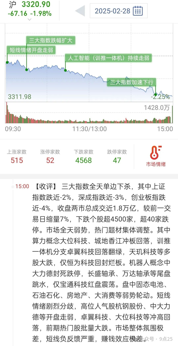 2025年2月28日复盘:惨!暴跌!科技股重挫引发恐慌,防御板块逆势崛起