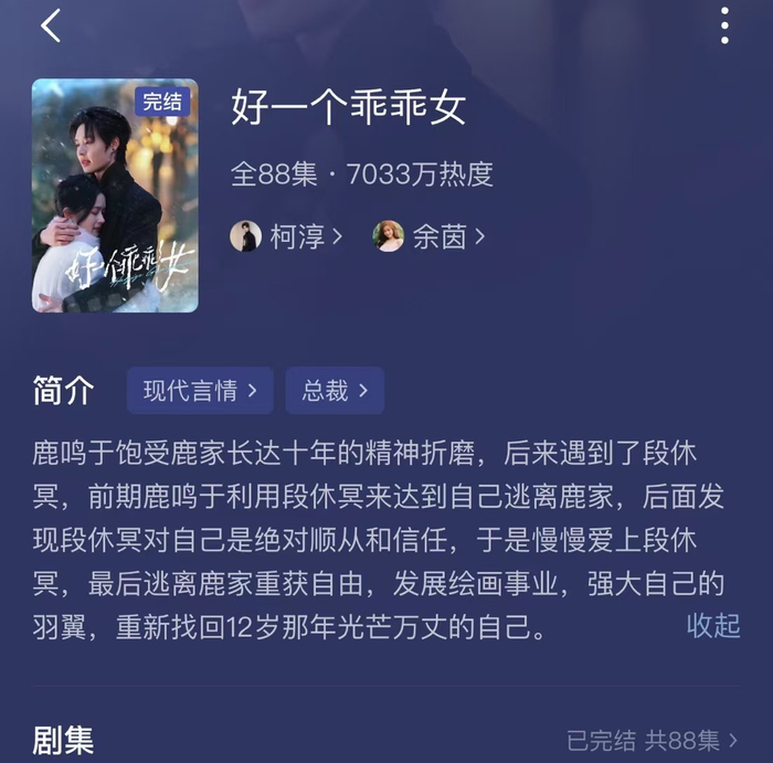 然而《好一个乖乖女》却在后春节档以黑马姿态脱颖而出,上线红果短剧首日热度破2000万,随后攀升至7000万,创平台纪录。截至2月27日,总观看量突破10亿,微博话题阅读量达1.7亿。主演赵柯淳一周涨粉超150万,成为短剧赛道“顶流级”演员。与此同时,制作公司于今无量也由此受到了大量的关注。