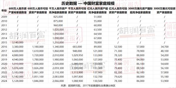 富裕家庭(资产600万以上)数量微降至512.8万户,同比减少0.3%;高净值家庭(资产千万以上)数量为206.6万户,同比减少0.8%;超高净值家庭(资产亿元以上)数量为13万户,同比减少1.7%;国际超高净值家庭(资产3000万美元以上)数量为8.6万户,同比减少2.3%。