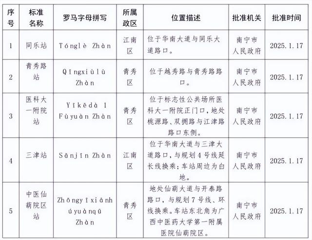 南宁地铁6号线一期沿线车站地名公布。