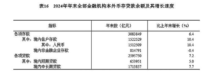 全年社会融资规模增量5232.3万亿元,按可比口径计算,比上年少3.3万亿元。年末社会融资规模存量53408.3万亿元,按可比口径计算,比上年末增长8.0%,其中对实体经济发放的人民币贷款余额252.5万亿元,增长7.2%。年末全部金融机构本外币各项存款余额308.4万亿元,比年初增加18.5万亿元,其中人民币各项存款余额302.3万亿元,增加18.0万亿元。全部金融机构本外币各项贷款余额259.6万亿元,增加17.3万亿元,其中人民币各项贷款余额255.7万亿元,增加18.1万亿元。人民币普惠小微贷款54余额32.9万亿元,增加4.2万亿元。本外币涉农贷款55余额51.4万亿元,增加4.7万亿元;制造业中长期贷款余额14.0万亿元,增加1.6万亿元;绿色贷款余额36.6万亿元,增加6.5万亿元。