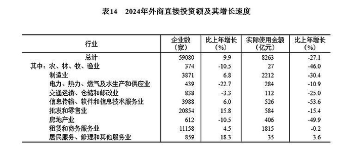 全年新设外商投资企业59080家,比上年增长9.9%。实际使用外资8263亿元,下降27.1%,折1162亿美元,下降28.8%。其中,共建“一带一路”国家(含通过部分自由港对华投资)对华新设外商投资企业17172家,增长23.8%;对华直接投资1147亿元,下降6.2%,折161亿美元,下降8.4%。高技术产业实际使用外资2864亿元,下降32.3%,折403亿美元,下降34.0%。