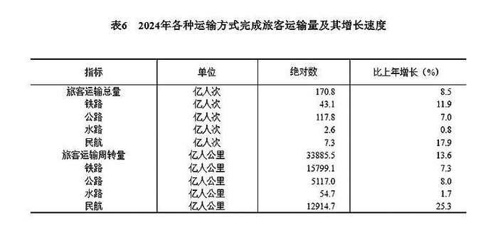 [29]自2024年1月起,公路旅客运输量、公路旅客运输周转量统计口径进行了调整,将班车包车客运量、公共汽电车城际城乡客运量、出租汽车(含巡游出租汽车、网络预约出租汽车)城际城乡客运量纳入公路旅客运输量统计,公路旅客运输周转量统计口径相应调整。2024年旅客运输总量、旅客运输周转量、公路旅客运输量、公路旅客运输周转量增速按可比口径计算。