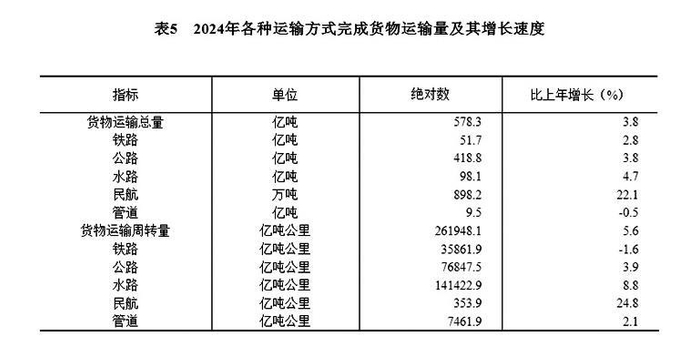 [28]货物运输总量及周转量包括铁路、公路、水路、民航和管道五种运输方式完成量,2024年增速按可比口径计算。