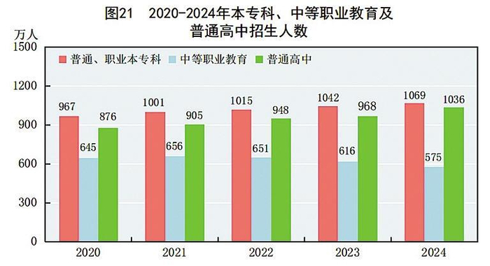 全年研究生教育招生135.7万人,在学研究生409.5万人,毕业生108.4万人。普通、职业本专科74招生1068.9万人,在校生3891.3万人,毕业生1059.4万人。中等职业教育75招生575.4万人,在校生1659.4万人,毕业生542.2万人。普通高中招生1036.2万人,在校生2922.3万人,毕业生891.0万人。初中招生1848.8万人,在校生5386.2万人,毕业生1698.2万人。普通小学招生1616.6万人,在校生10584.4万人,毕业生1857.3万人。特殊教育招生15.8万人,在校生91.6万人,毕业生17.7万人。学前教育在园幼儿3584.0万人。九年义务教育巩固率为95.9%,高中阶段毛入学率为92.0%。