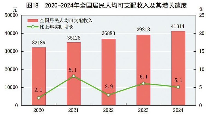 全年全国居民人均可支配收入41314元,比上年增长5.3%,扣除价格因素,实际增长5.1%。全国居民人均可支配收入中位数6134707元,增长5.1%。按常住地分,城镇居民人均可支配收入54188元,比上年增长4.6%,扣除价格因素,实际增长4.4%。城镇居民人均可支配收入中位数49302元,增长4.6%。农村居民人均可支配收入23119元,比上年增长6.6%,扣除价格因素,实际增长6.3%。农村居民人均可支配收入中位数19605元,增长4.6%。城乡居民人均可支配收入比值为2.34,比上年缩小0.05。按全国居民五等份收入分组62,低收入组人均可支配收入9542元,中间偏下收入组人均可支配收入21608元,中间收入组人均可支配收入33925元,中间偏上收入组人均可支配收入53359元,高收入组人均可支配收入98809元。全国农民工人均月收入4961元,比上年增长3.8%。脱贫县63农村居民人均可支配收入17522元,比上年增长6.9%,扣除价格因素,实际增长6.5%。