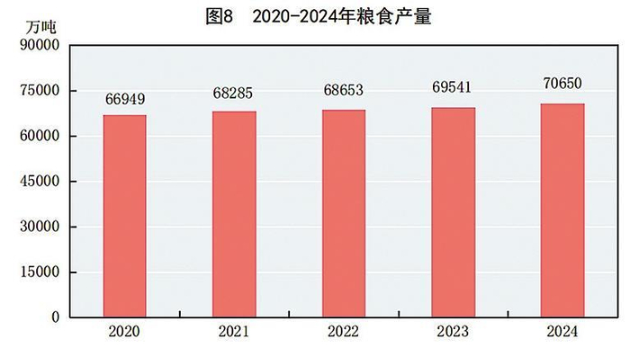 全年粮食产量70650万吨,比上年增加1109万吨,增产1.6%。其中,夏粮产量14989万吨,增产2.6%;早稻产量2817万吨,减产0.6%;秋粮产量52843万吨,增产1.4%。谷物产量65229万吨,比上年增产1.7%。其中,稻谷产量20753万吨,增产0.5%;小麦产量14010万吨,增产2.6%;玉米产量29492万吨,增产2.1%。大豆产量2065万吨,比上年减产0.9%。