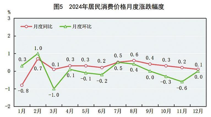 全年居民消费价格比上年上涨0.2%。工业生产者出厂价格下降2.2%。工业生产者购进价格下降2.2%。农产品生产者价格9下降0.9%。12月份,70个大中城市中,新建商品住宅销售价格环比上涨的城市个数为23个,持平的为4个,下降的为43个;二手住宅销售价格环比上涨的城市个数为9个,持平的为1个,下降的为60个;新建商品住宅销售价格同比上涨的城市个数为2个,下降的为68个;二手住宅销售价格同比下降的城市个数为70个。