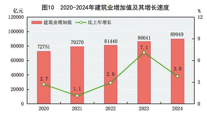 全年建筑业增加值89949亿元,比上年增长3.8%。全国具有资质等级的总承包和专业承包建筑业企业利润7513亿元,比上年下降9.8%,其中国有控股企业利润3669亿元,下降8.7%。