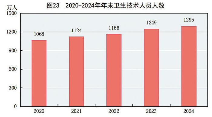 年末全国共有医疗卫生机构109.2万个,其中医院3.9万个,在医院中有公立医院1.2万个,民营医院2.7万个;基层医疗卫生机构104.0万个,其中乡镇卫生院3.3万个,社区卫生服务中心(站)3.7万个,门诊部(所)39.8万个,村卫生室57.1万个;专业公共卫生机构9217个(不含卫生监督所、中心),其中疾病预防控制中心3429个。卫生技术人员1295万人,其中执业医师和执业助理医师505万人,注册护士584万人。医疗卫生机构床位1037万张,其中医院818万张,乡镇卫生院151万张。全年总诊疗人次79101.1亿人次,出院人次803.1亿人次。