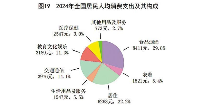 全年全国居民人均消费支出28227元,比上年增长5.3%,扣除价格因素,实际增长5.1%。其中,人均服务性消费支出6413016元,比上年增长7.4%,占居民人均消费支出比重为46.1%。按常住地分,城镇居民人均消费支出34557元,增长4.7%,扣除价格因素,实际增长4.5%;农村居民人均消费支出19280元,增长6.1%,扣除价格因素,实际增长5.8%。全国居民恩格尔系数为29.8%,其中城镇为28.8%,农村为32.3%。