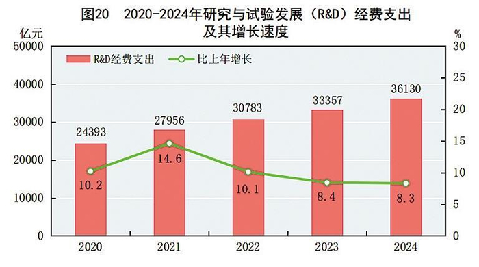 全年研究与试验发展(R&D)经费支出36130亿元,比上年增长8.3%,与国内生产总值之比为2.68%,其中基础研究经费2497亿元,比上年增长10.5%,占R&D经费支出比重为6.91%。国家自然科学基金共资助5.49万个项目。截至年末,纳入新序列管理的国家工程研究中心206个,国家发展改革委认定的企业技术中心1798家。国家科技成果转化引导基金累计设立36只子基金,资金总规模624亿元。国家级科技企业孵化器681606家,国家备案众创空间692376家。全年授予发明专利权104.5万件,比上年增长13.5%。PCT专利申请受理量707.5万件。截至年末,有效发明专利568.9万件,比上年末增长14.0%。每万人口高价值发明专利拥有量7114件。全年商标注册478.1万件,比上年增长9.1%。全年共签订技术合同99万项,技术合同成交金额68354亿元,比上年增长11.2%。我国公民具备科学素质72的比例达到15.37%。