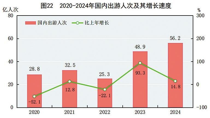 全年国内出游56.2亿人次,比上年增长14.8%。其中,城镇居民国内出游43.7亿人次,增长16.3%;农村居民国内出游12.5亿人次,增长9.9%。国内游客出游总花费57543亿元,增长17.1%。其中,城镇居民出游花费49293亿元,增长18.0%;农村居民出游花费8250亿元,增长12.2%。入境游客13190万人次,增长60.8%,其中外国人2694万人次,香港、澳门和台湾同胞10496万人次。入境游客总花费942亿美元,增长77.8%。通过免签入境外国人2012万人次,增长112.3%。内地居民出境14589万人次,其中因私出境14015万人次,赴港澳台出境9712万人次。