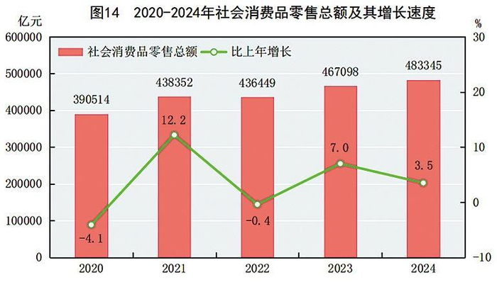 全年社会消费品零售总额38483345亿元,比上年增长3.5%。按经营地分,城镇消费品零售额417813亿元,增长3.4%;乡村消费品零售额65531亿元,增长4.3%。按消费类型分,商品零售额427165亿元,增长3.2%;餐饮收入56180亿元,增长5.3%。服务零售额39比上年增长6.2%。