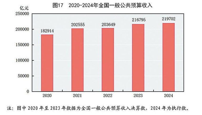 全年全国一般公共预算收入219702亿元,比上年增长1.3%;其中税收收入174972亿元,下降3.4%。全国一般公共预算支出284612亿元,比上年增长3.6%。全年现行支持科技创新和制造业发展的主要政策减税降费及退税金额26293亿元。