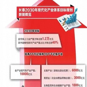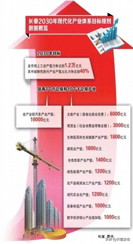 聚焦守牢实体经济根基,统筹推动传统产业转型、优势产业壮大和新质生产力培育,加快构建“3转、4强、7新”现代化产业体系,着力在推进新型工业化上下功夫,推动传统制造业高端化、智能化、绿色化发展,以新能源、新装备、新材料、新医药等为突破方向,积极发展战略性新兴产业,布局建设未来产业,推动数字产业化和产业数字化,进一步做大经济总量、优化产业结构,促进教育科技人才产业一体化发展,持续增强长春现代化都市圈优质资源要素聚合力、产业集中承载力和辐射带动能力。到2030年,全市规上工业产值力争达到1.2万亿元,其中战略性新兴产业产值占比力争达到40%。培育1个万亿级和10个千亿级产业,包括全产业链汽车产业产值达到10000亿元;文旅产业(游客出游总花费)达到6000亿元,商贸业(社会消费品零售总额)达到3000亿元,生物医药和生命健康产业产值、建筑业产值均达到1800亿元,光电信息产业产值达到1400亿元,绿色能源产业产值、农产品精深加工产业产值、现代农业总产值均达到1200亿元,装备制造产业产值、数字经济核心产业增加值均达到1000亿元。