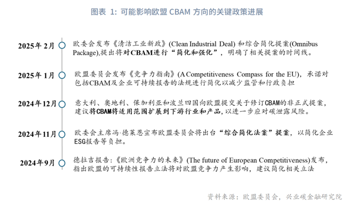 二是欧盟官方在2024年9月和2025年1月分别出台了“德拉吉报告”和《竞争力指南》,承诺将努力简化企业的报告负担,而修订简化可持续发展报告指令、尽职调查指令和欧盟分类法等法规将是相关措施的第一步,对CBAM的简化措施也在其计划中。