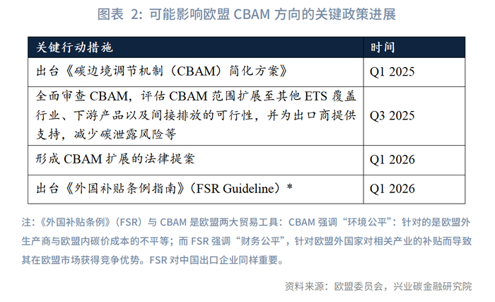 在同日发布的《清洁工业新政》中,欧盟委员会明确了下一步CBAM的关键时间节点:2025年下半年,欧盟委员会将出台评估报告,包含对CBAM的全面审查,并评估CBAM范围扩展至其他ETS覆盖行业、下游产品以及间接排放的可行性;2026年初,将形成相关的法律提案进入立法程序。