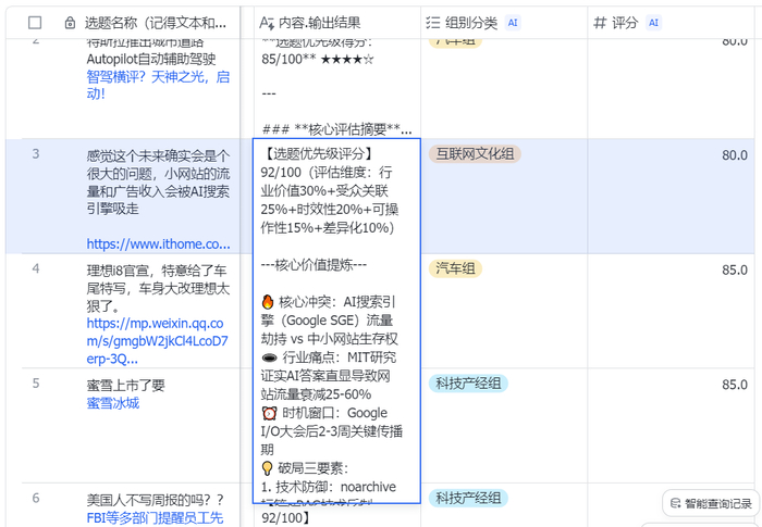 看完演示后,知危编辑部选择立马上手,搭了一个选题库处理系统。因为我们每天提报选题量大,以往在判定选题价值上,有时需要花费一到两个小时的时间。