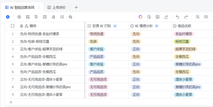茶百道数字化产品经理就在多维表格里建了一个回复系统。不需要人工干预,AI 自动识别评论情感走向,并打标分类。比如杨枝甘露是正向评价还是负向多,差评是因为物流还是产品品质,再调出 DeepSeek 来一键回复。
