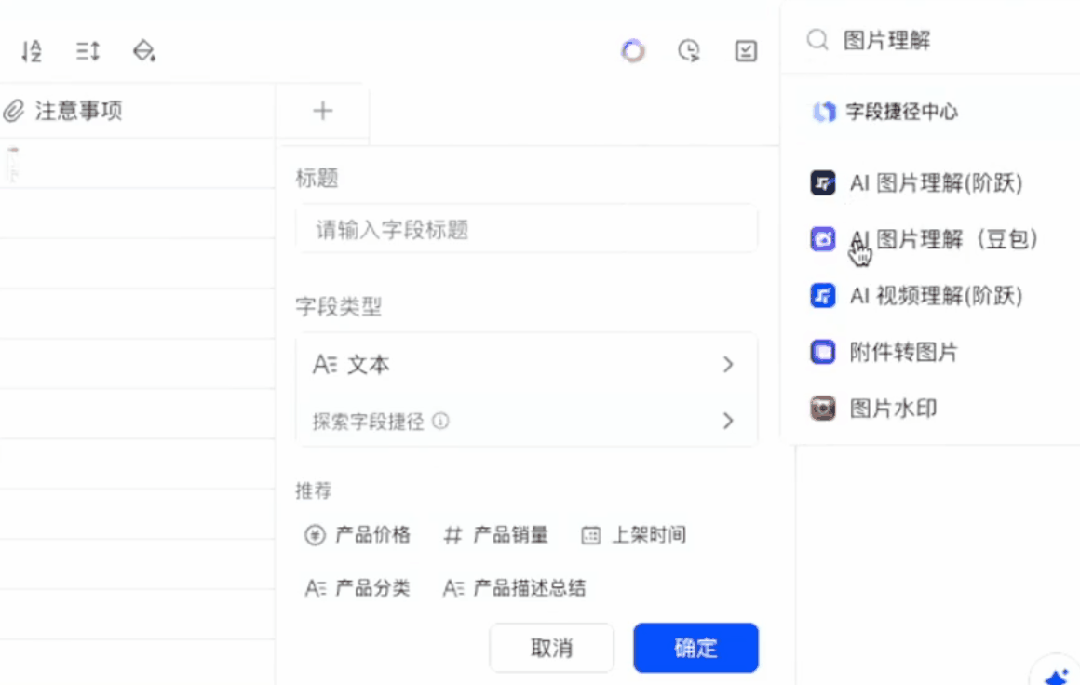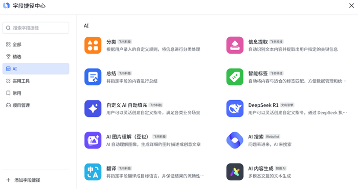 和其他粗暴地放一个问答入口不同,飞书把 DeepSeek 揉进了多维表格里。在表格里新建一列,再选择【字段捷径】,就能调用出 DeepSeek R1 接口。
