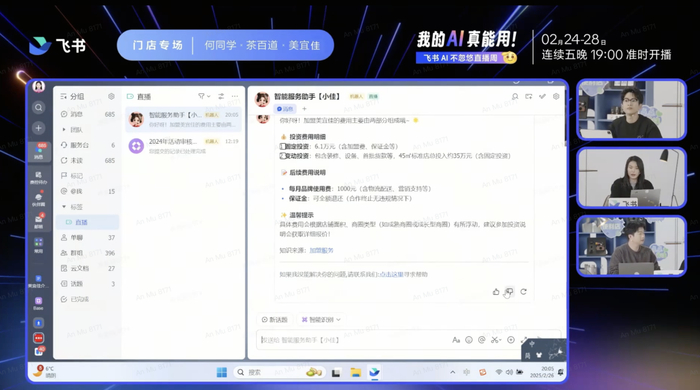 果不其然,在第三天的直播间分享里,美宜佳和茶百道这种大型门店都表示已经在用飞书 AI 管理上万家店铺了。