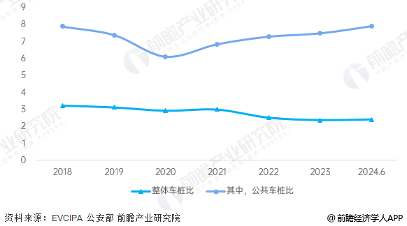 从整体上看,2018-2024年间,整体车桩呈下降趋势,由2018年的3.23降至2024年6月底的2.41。而公共车桩比呈现波动变化态势,2024年6月底为7.92,公共充电桩数量仍存在较大缺口。