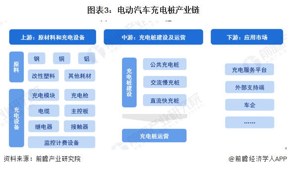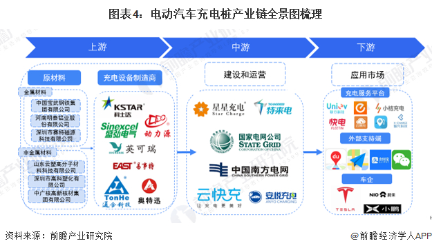 从我国电动汽车充电桩产业链上的参与企业来看,上游生产商主要是宝武钢铁、明泰铝业等原材料供应商和科士达、盛弘电气、易事特等充电设备制造商;中游建设和运营商主要是星星充电、特来电、国家电网、南方电网等;下游应用市场主要是以小桔充电为代表的充电服务平台、以百度地图和支付宝为代表外部支持平台和以小鹏、蔚来等为代表的新能源汽车企业。