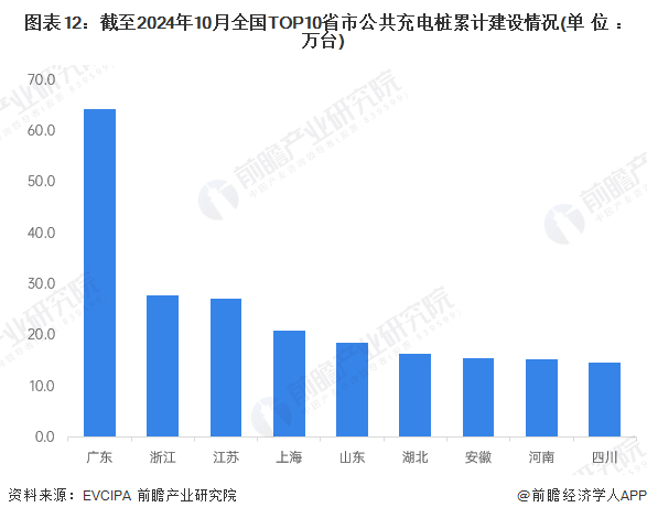 截止2024年10月,全国各地区公共充电桩建设排名表TOP10分别是:广东、浙江、江苏、上海、山东、湖北、安徽、河南、四川、北京。其中广东省数量达到64.4万台,占全国19%,遥遥领先其他地区。