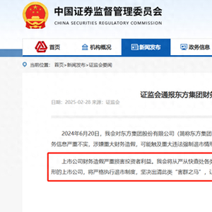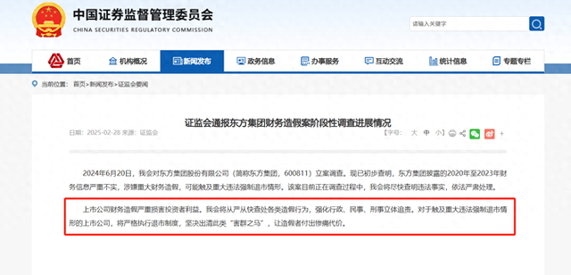 2月28日,证监会通报东方集团财务造假案阶段性调查进展情况,去年6月20日监会对东方集团立案调查。现已初步查明,东方集团披露的2020年至2023年财务信息严重不实,涉嫌重大财务造假,可能触及重大违法强制退市情形。该案目前正在调查过程中,证监会将尽快查明违法事实,依法严肃处理。