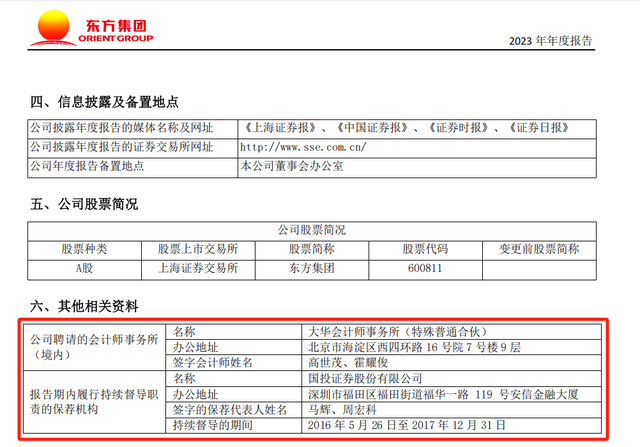东方集团2023年及近年财报显示,报告期内履行持续督导职责的保荐机构是国投证券,但标明的持续督导的期间则是2016年5月26日至2017年12月31日。