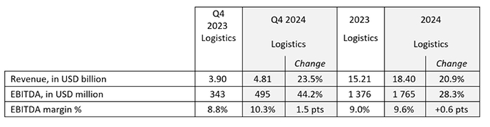 2024年全年,达飞集团的物流业务继续增长,特别是受到整合Bolloré Logistics以及合同物流的推动,尽管汽车行业面临困难。