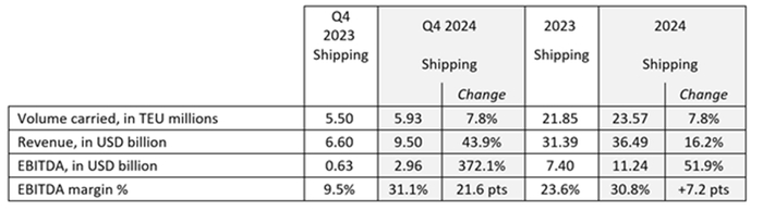 2024年全年载箱量达到2357万TEU,同比增长7.9%。这一增长主要得益于持续强劲需求。海运业务营收同比增长16.2%,达到364.9亿美元。EBITDA为112.4亿美元,同比增长51.9%,EBITDA利润率同比增加7.2个百分点至30.8%。这得益于单箱平均运费增长7.7%,达到1548美元。