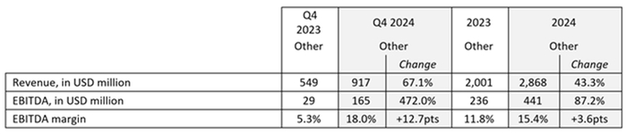 与此同时,包括达飞空运、港口码头和媒体等业务,2024年全年营业收入增长43.3%至28.7亿美元,EBITDA为4.4亿美元,同比增长87.2%;EBITDA利润率同比增加3.6个百分点至15.4%。