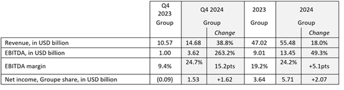 2024年四季度,达飞集团实现总营业收入146.8亿美元,同比增长38.9%;息税折旧摊销前利润(EBITDA)达到36.2亿美元,同比增长262.0%;EBITDA利润率同比增长15.3个百分点至24.7%;集团净利润达到15.3亿美元,较上年同期增加16.2亿美元。