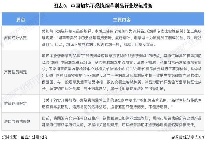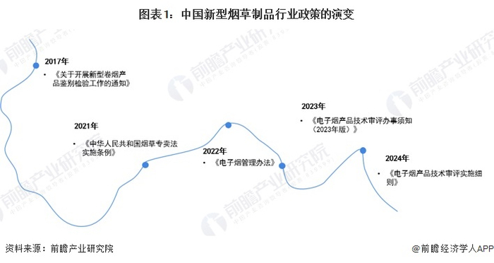 2017年5月11日,国家烟草专卖局召开电视电话会议,首次提出要“加强对加热不燃烧烟草制品的市场监管,在全国范围内开展专项整顿清理”。2017年10月,国家烟草专卖局制定下发了《关于开展新型卷烟产品鉴别检验工作的通知》,各省级质检站开展IQOS卷烟鉴别检验工作,国家烟草质量监督检验中心以文件形式发布了包括菲莫国际的IQOS、英美烟草的GLO、日本烟草的PLOOM、雷诺烟草的REVO在内的四种类新型卷烟产品纳入卷烟鉴别检验目录。2021年11月10日,国务院公布《国务院关于修改〈中华人民共和国烟草专卖法实施条例〉的决定》,在《中华人民共和国烟草专卖法实施条例》中增加了“电子烟等新型烟草制品参照本条例卷烟的有关规定执行”的规定。2022年3月至今,期间发布的《电子烟管理办法》、《关于对电子烟相关生产企业核发烟草专卖生产企业许可证工作的指导意见》、《关于对电子烟征收消费税的公告》以及《电子烟产品技术审评实施细则(征求意见稿)》等一系列政策措施,使得电子烟等新型烟草行业进入强监管时代,国内电子烟等新型烟草在生产规范、流通销售、税收等方面均向传统卷烟看齐。