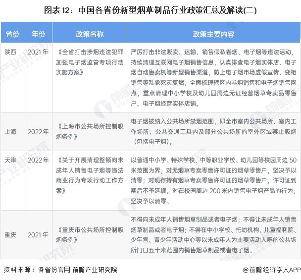 青少年健康是国家和各省级单位共同关注的问题,电子烟虽为新型烟草相比传统卷烟不含尼古丁等有害物质,但其致瘾性对于青少年来说仍是不可忽视的问题,因此诸多省份如福建省、甘肃省、海南省以及河南省等多个省份禁止向青少年出售电子烟,并且陕西省、天津市、重庆市等省或直辖市地区对于普通中小学、特殊学校、中等职业学校、幼儿园等校园周边50-200米电子烟零售网点坚决清0,甘肃省对于违法向未成年人售烟(含电子烟)最高罚款五十万元。除保障青少年健康安全外,除此之外,多数地区如上海市等将电子烟被纳入公共场所禁烟范围,即全市室内公共场所、室内工作场所、公共交通工具内及部分公共场所的室外区域禁止吸烟(包括电子烟)。