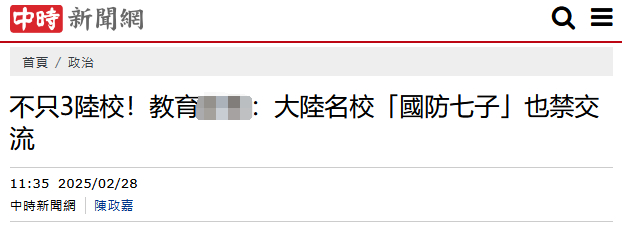 2月28日,多家台媒报道,台教育部门负责人郑英耀在接受台湾媒体采访时宣称,将北京航空航天大学、北京理工大学、西北工业大学、南京航空航天大学、南京理工大学、哈尔滨工业大学、哈尔滨工程大学等大陆“国防七子”,列入禁止两岸交流合作的“黑名单”。
