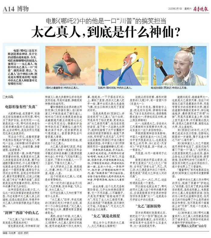 电影《哪吒2》还在不断创造票房神话,关于它的话题也越来越多。今天,咱们来聊聊哪吒的制造人兼师父——太乙真人。电影中的太乙真人一口“川普”,搞笑诙谐。那么,“太乙真人”这个神话人物,到底是从哪里来的呢?电影中的太乙真人和原著中又有哪些不同?