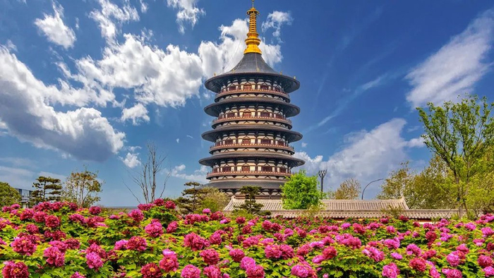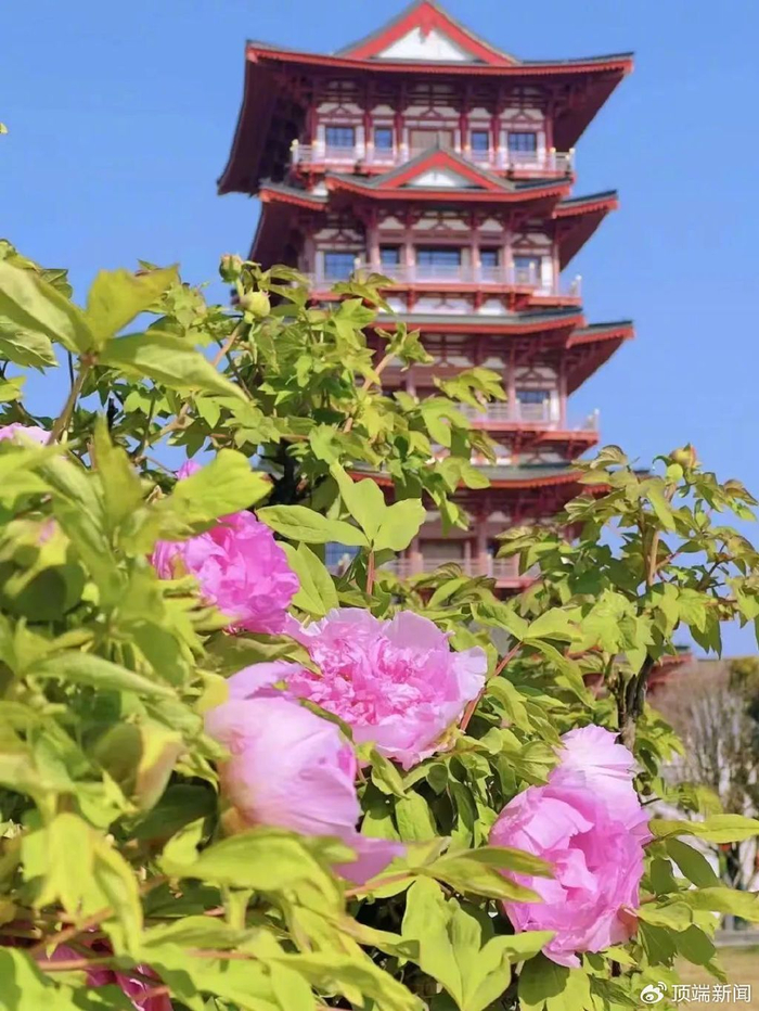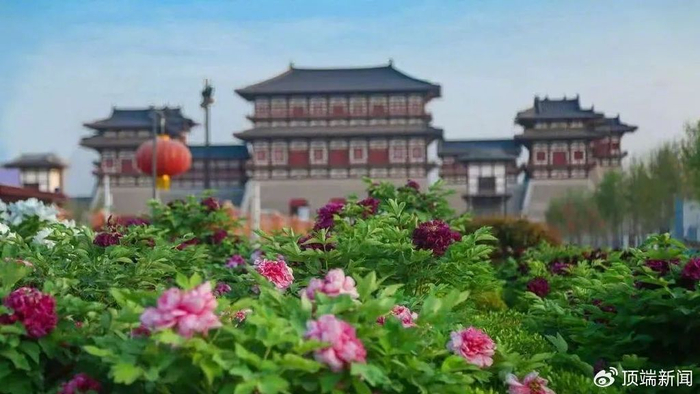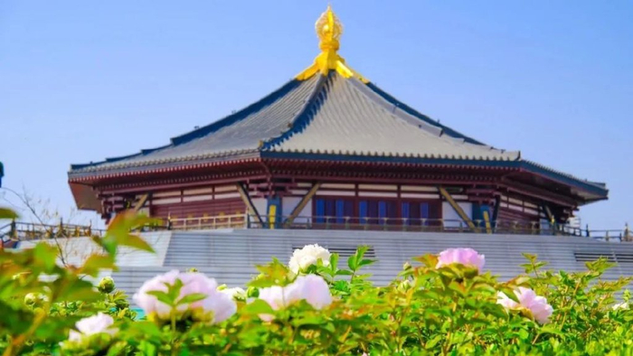 牡丹阁这座依唐风建筑规制而建的塔式楼阁,在湛蓝春日天空的映衬下,庄重典雅,传统与现代元素完美融合,尽显独特艺术魅力,古韵扑面而来。