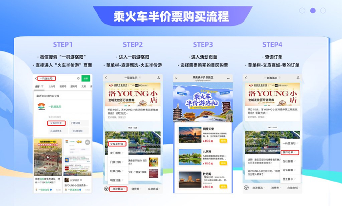 购票规则:游客通过“一码游洛阳”微信公众号、小程序、APP(享游洛阳)等平台预约购买景区火车/高铁活动半价票,购买成功后可凭纸质车票或电子订单(截图无效)按预约日期半价参观游览相应景区。