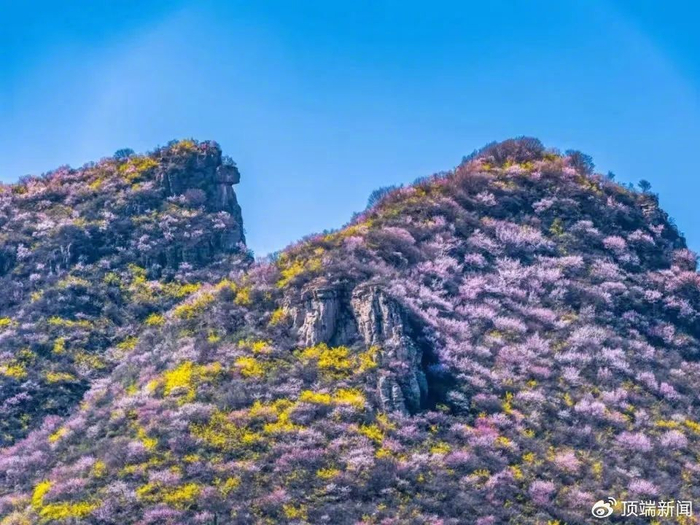 荆紫仙山宛如被大自然打翻了的调色盘,山上树木郁郁葱葱,各色花朵如繁星般点缀其间,与漫山遍野的新绿相互映衬,构成一幅五彩斑斓的春日画卷。