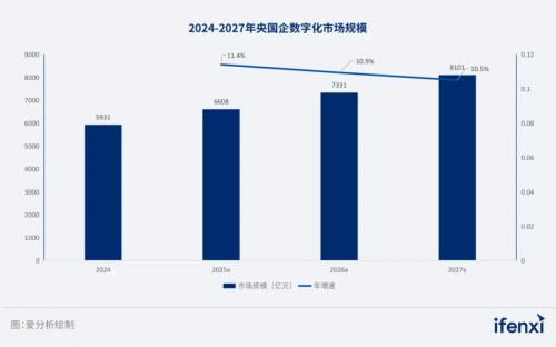 央国企数字化转型是推动行业高质量发展的关键驱动力。随着需求侧的持续投入与供给侧的不断创新,央国企数字化市场将迎来新的发展机遇。根据爱分析的测算,2024年央国企数字化市场规模约为5931亿元人民币。预计2025年至2027年期间,该市场将保持10.7%的年复合增长率(CAGR),到2027年市场规模有望达到8101亿元人民币。