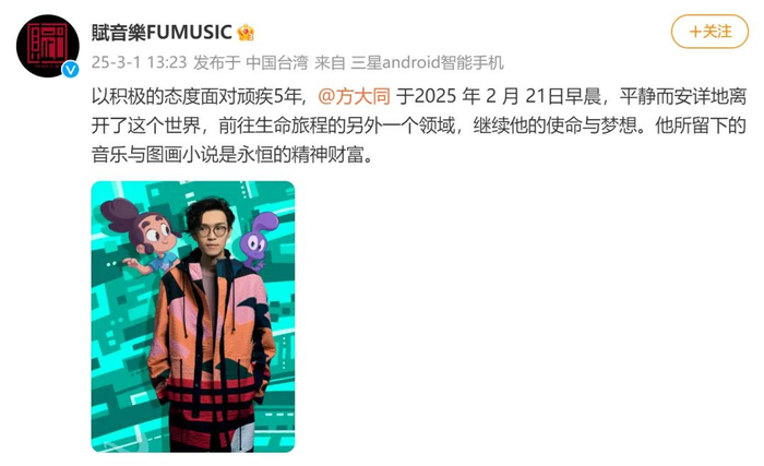 3月1日,歌手方大同独立音乐厂牌@赋音乐FUMUSIC 发布消息称,在积极面对顽疾5年后,方大同于2025年2月21日早晨去世。